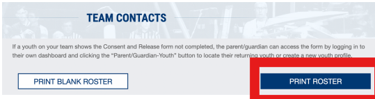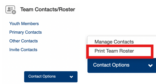 - Under ‘My Teams,” select the team you are printing the roster for and go to “Team contacts / Roster.”